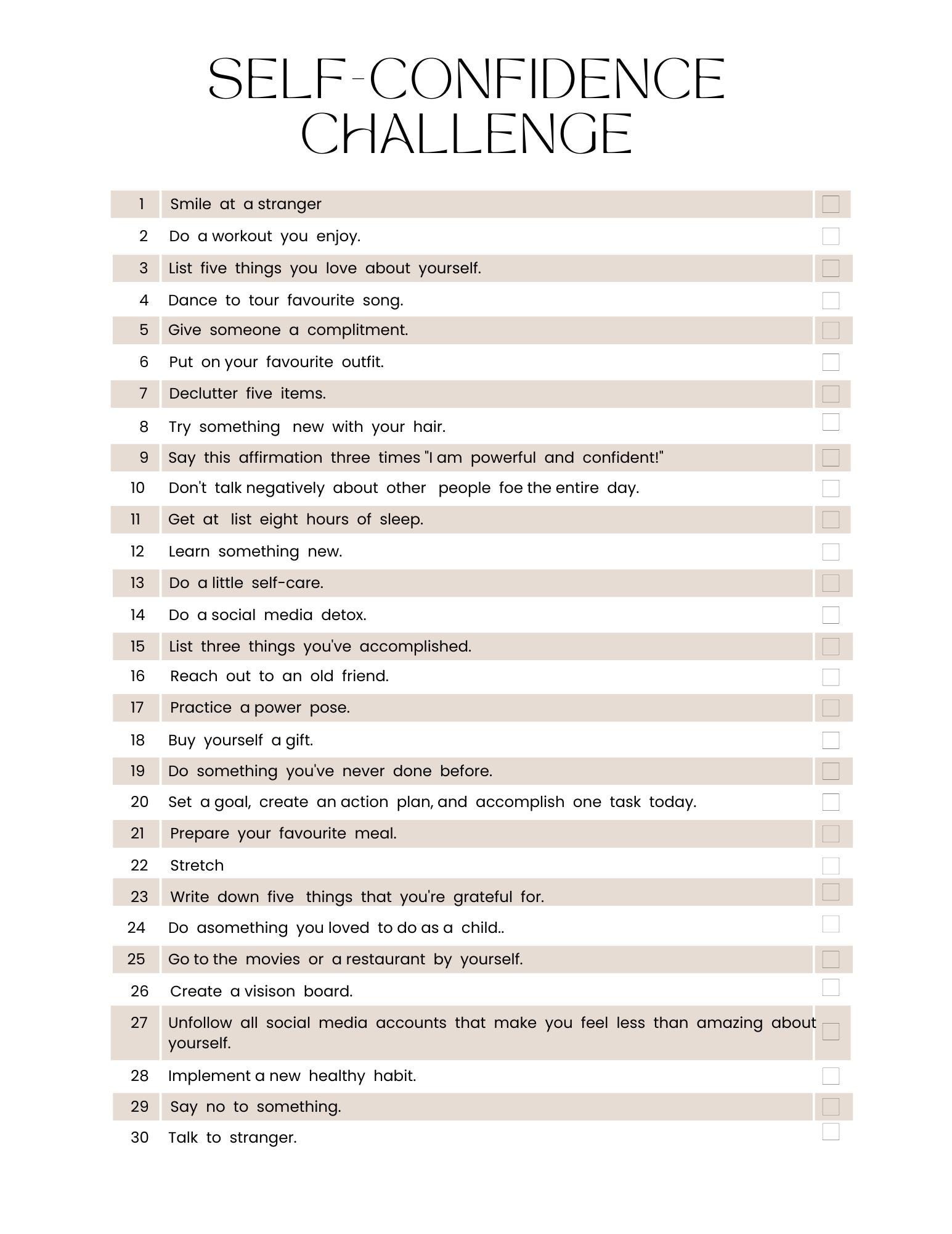 • Self-confidence challenges (smile at a stranger, do a workout you enjoy, step outside your comfort zone)